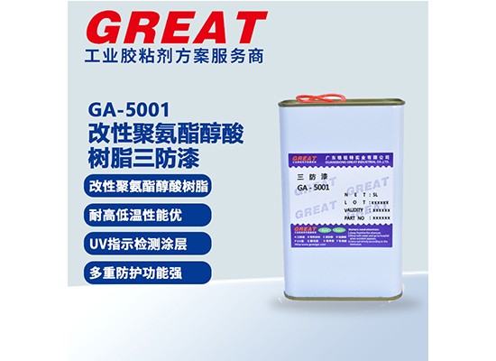 GA-1001 为低粘度单组份有机硅苯基树脂披覆三防漆,可室温固化,也可溶剂挥发后加温加速固化,应用于厚膜电路系统,多孔基材及印刷线路板的涂层保护.是一种特殊配方的涂料,用于保护线路板及其相关设备免受坏境的侵蚀,具有良好的耐高低温性能,固化后形成一层透明保护膜。